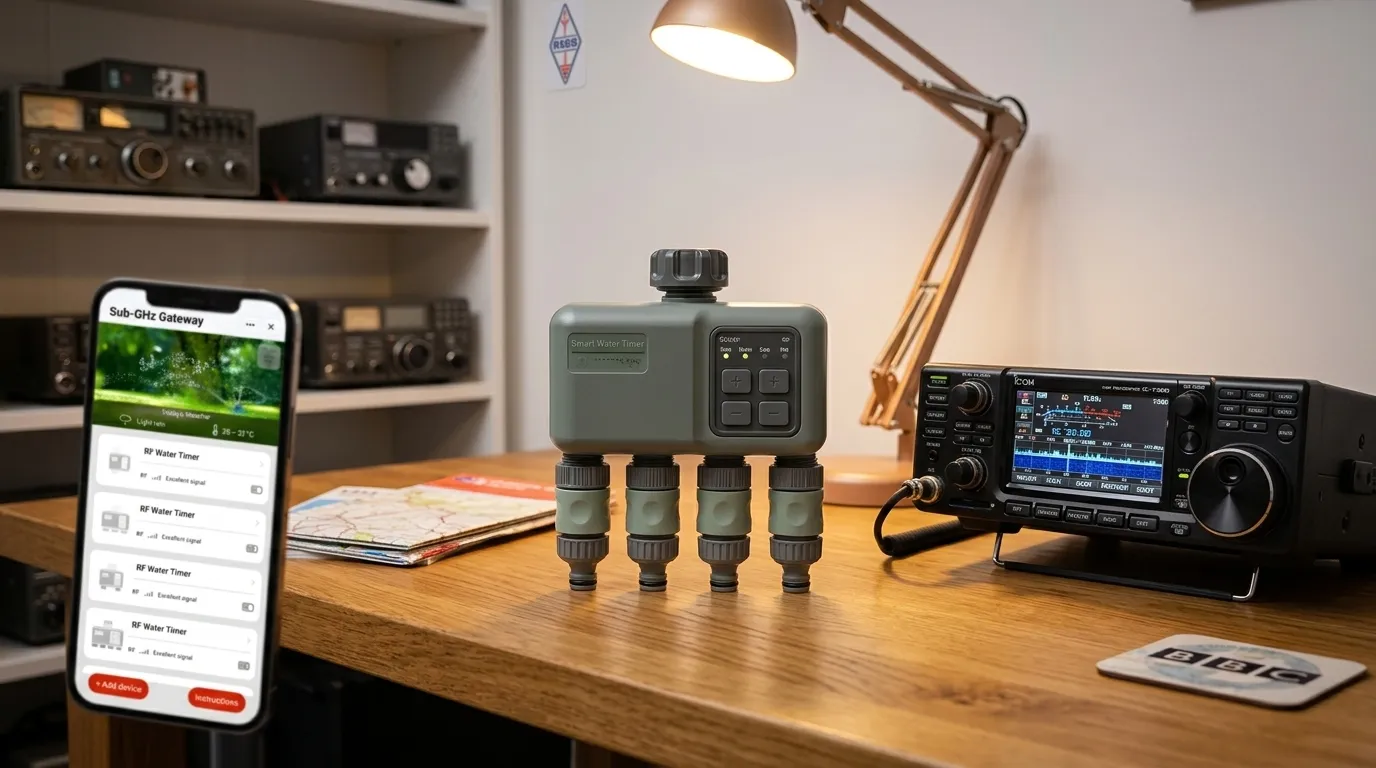 We developed our flagship RF Gateway technology to bridge the gap. By using a powerful 984ft Sub-1GHz radio frequency instead of standard Bluetooth or WiFi at the tap, our controllers penetrate standard UK masonry with ease. You simply plug the gateway indoors near your router, and it broadcasts a rock-solid signal to the tap timer at the bottom of the garden.